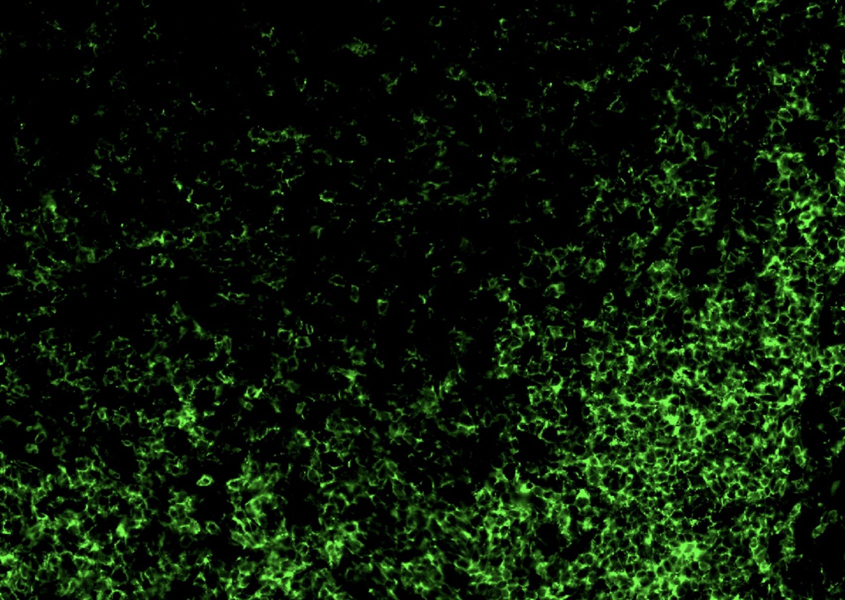 FFPE human tonsil stained with anti-human CD4 at 1ug/ml and detected using anti-rabbit IgG labeled with a RightON 490 kit and used at 5ug/ml